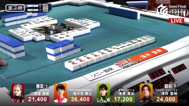 東2局2本場、供託が1本ある。亜樹が二副露して、トイトイをファーストテンパイ。堂岐が門前で追いつき、タンヤオをダマテンに構える。最後に浅見からロンアガリをしたのは堂岐だった。1300は1900を手にする。