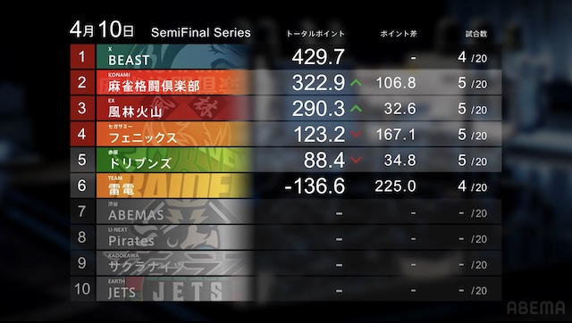 麻雀プロリーグ「ZOZOTOWN Mリーグ2025-26」セミファイナルシリーズ4日目が4月10日(金)に開催された。