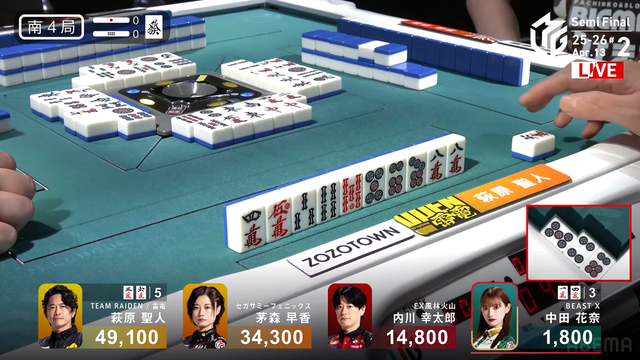待ちでリーチ。結果は内川、茅森、萩原の3人テンパイで流局。