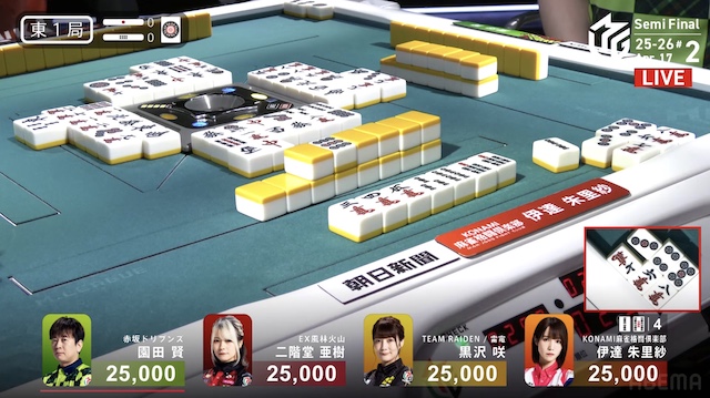 東1局、園田は赤赤の手牌を生かして一気通貫へ、伊達はドラも赤もない中タンヤオへ、それぞれ向かう。ファーストテンパイを入れたのは、伊達。山に4枚眠っている![]()