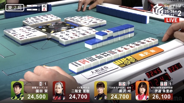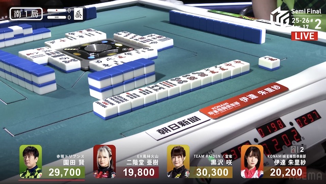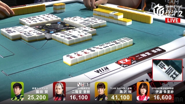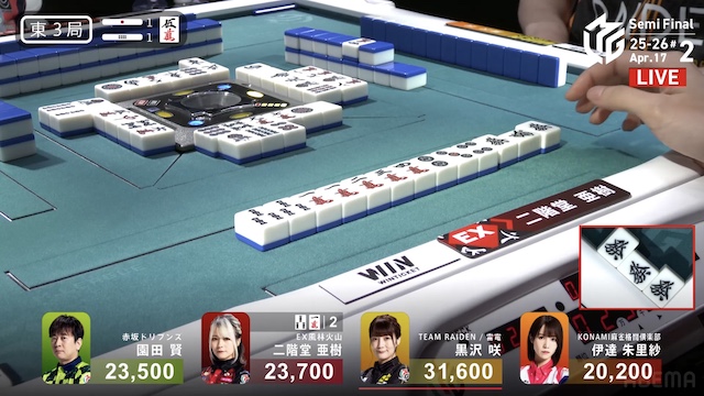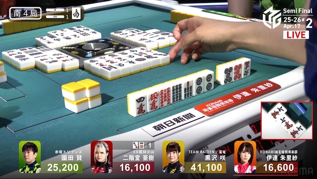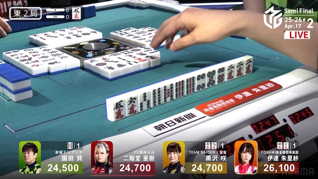 東2局、伊達が3巡目に先制リーチ。黒沢は門前で追いついたが、こちらはダマテンを選択した。さらに、仕掛けていた園田もテンパイ。三者ともにアガリ牌は山に1枚ずつ生きている。伊達がホウテイで打った