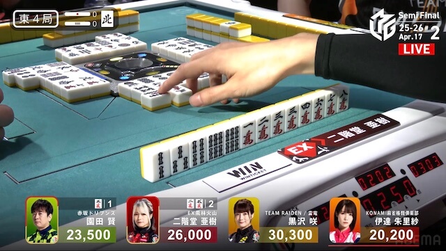 東4局、亜樹が13巡目に先制リーチ。園田がすぐに追いつき、リーチで対抗すると、亜樹がツモ切った