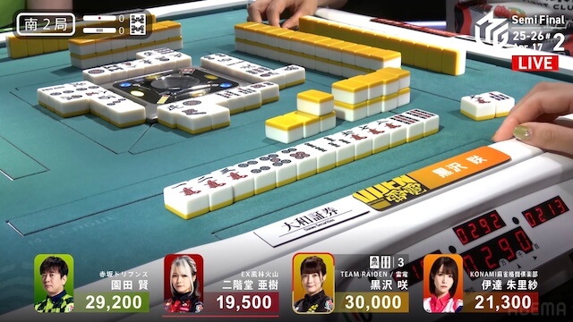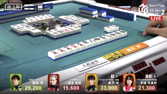 南2局、黒沢が6巡目に先制リーチ。亜樹からロンアガリすると、裏ドラを1枚乗せて、3900とした。