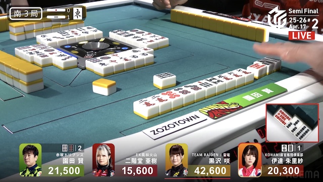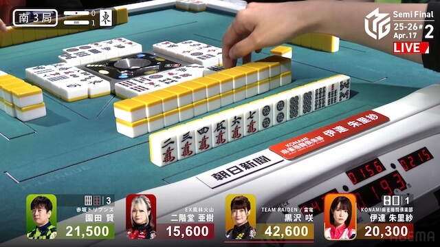 南3局、トップ目で親の黒沢がファーストテンパイ。1巡だけ役なしでツモった時のみアガれる形にするが、次巡ツモ切りリーチを敢行した。3着目の伊達が門前で追いつき、リーチで応戦する。黒沢のアガリ牌は山から姿を消したが、園田のテンパイ打牌が