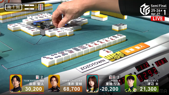 南1局3本場、親の萩原がペン