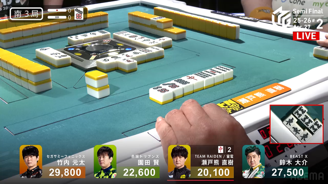 南3局3本場、親の瀬戸熊がタンヤオのカン