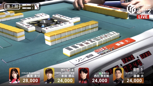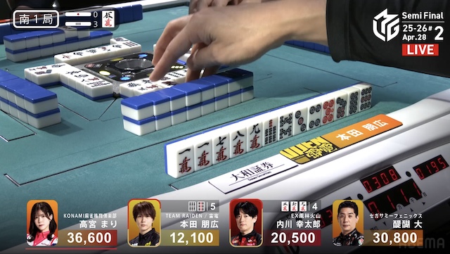 待ちに。醍醐が仕掛けてタンヤオに向かうと、すぐに高宮からロンアガリ。1000は1300で、本田の大物手をかわした。