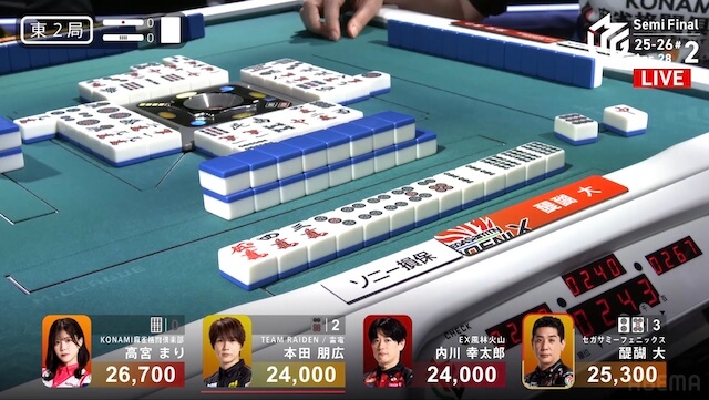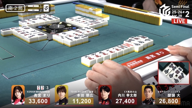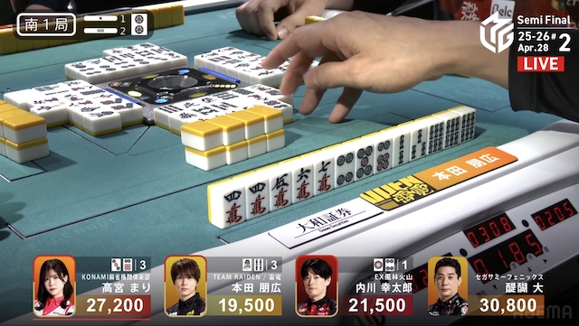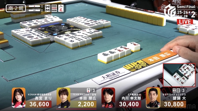 南2局2本場、供託が1本ある。捨て牌が三段目に差し掛かったところで、トップ目の高宮がファーストテンパイ。本田からロンアガリで、2000は2600とし、1局消化した。