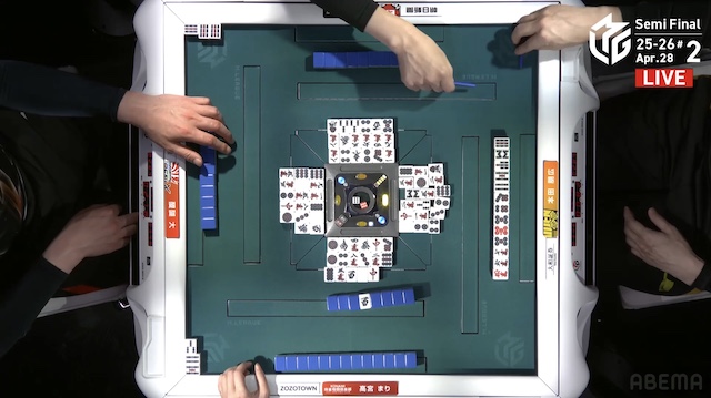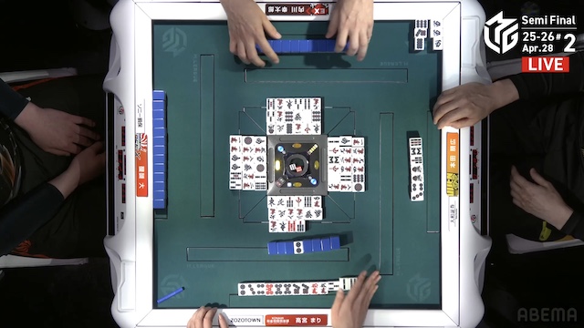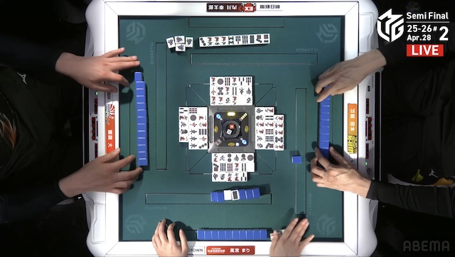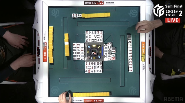 があり、ロンアガリはできない。3着目の醍醐が、宣言牌をチーしてテンパイ。さらにトップ目の高宮にもテンパイが入り、三軒テンパイによるめくり合いに。醍醐は最終手番で危険牌をつかみ、オリを選択した。アガリは生まれず、二軒テンパイで流局となる。