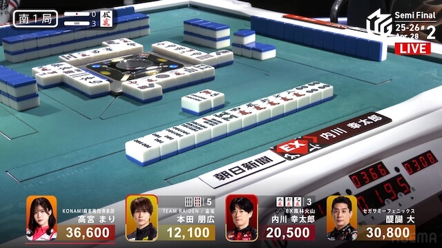 南3局、トップ目の高宮が1つしかけてタンヤオのファーストテンパイ。2着目で親の内川は、ドラの