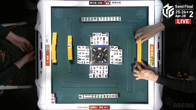 をポンしていた本田も、追いついてテンパイ。しかし終盤、2人の待ち牌は山から姿を消し、二軒テンパイで流局した。