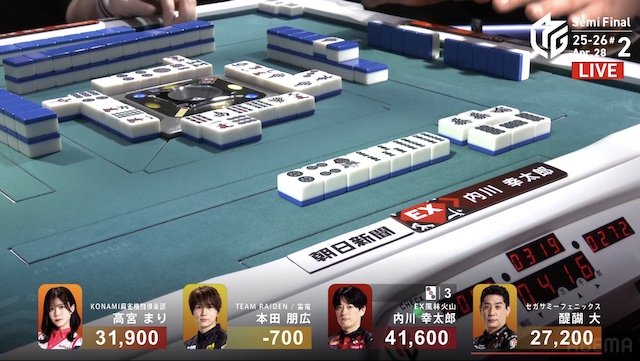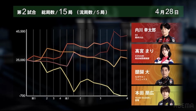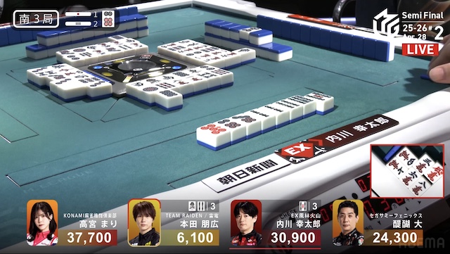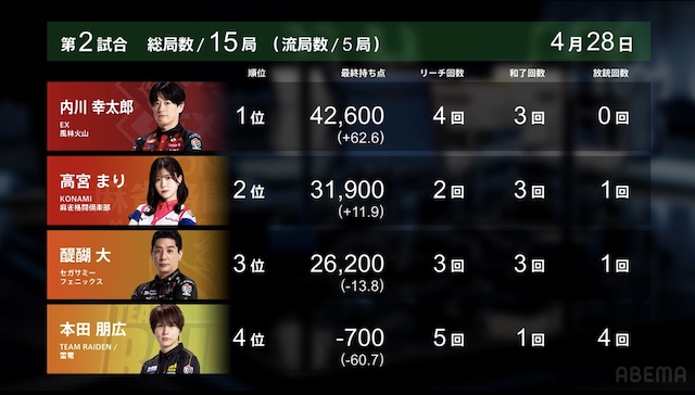 を引きにいく。3着目で親の醍醐から打ち取り、内川は自身のトップを確定させて試合終了となった。