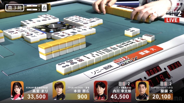を加カンすると、高宮は危険牌を引いてオリを選択。その後、内川にテンパイが入った。最後は一軒テンパイで流局。