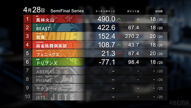 フェニックスは20戦を終え、麻雀格闘倶楽部が最終日に87.4ポイント以上失いドリブンズが98.4ポイント以上加点した場合のみファイナル進出というかなり苦しい条件での結果待ちとなった。