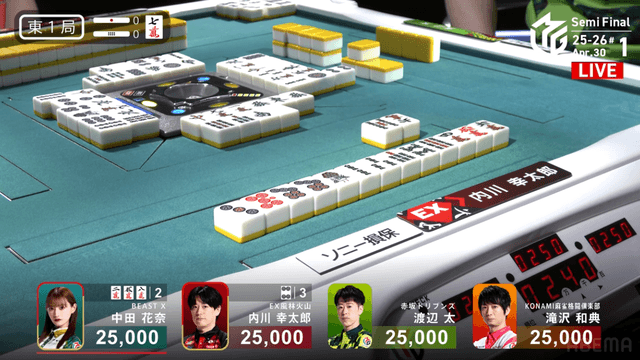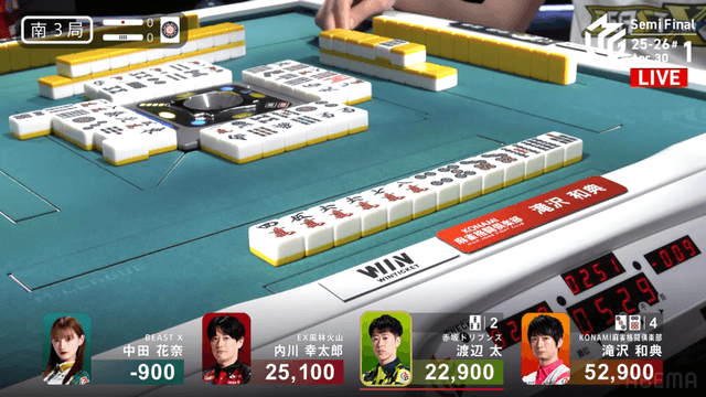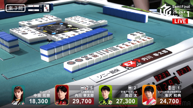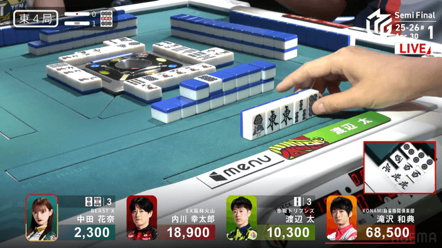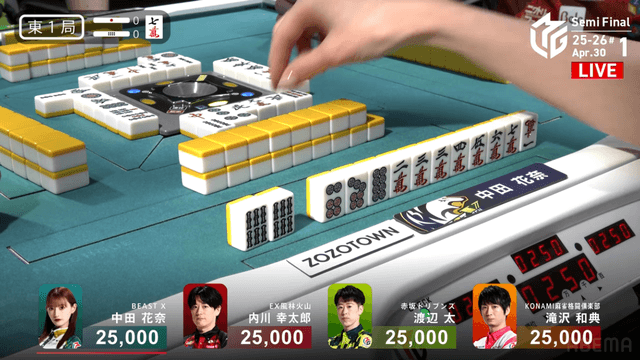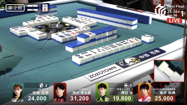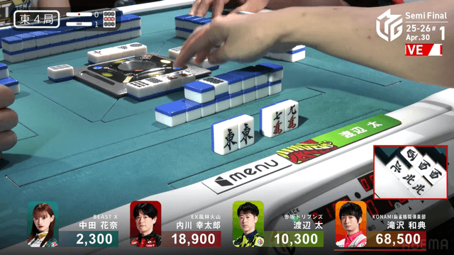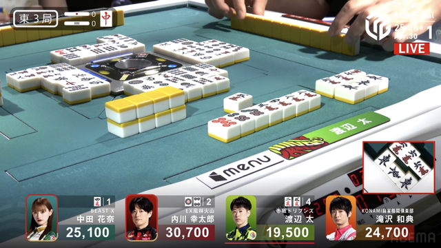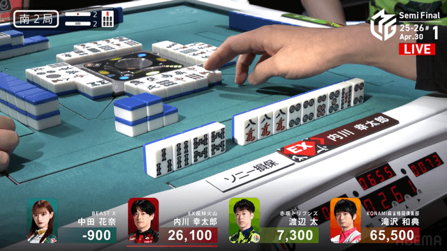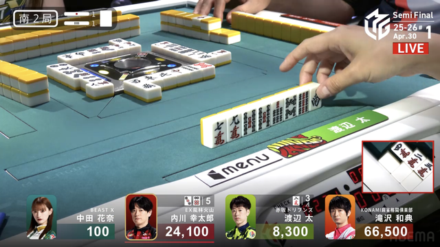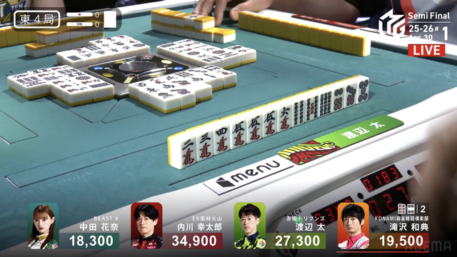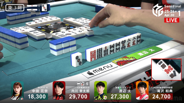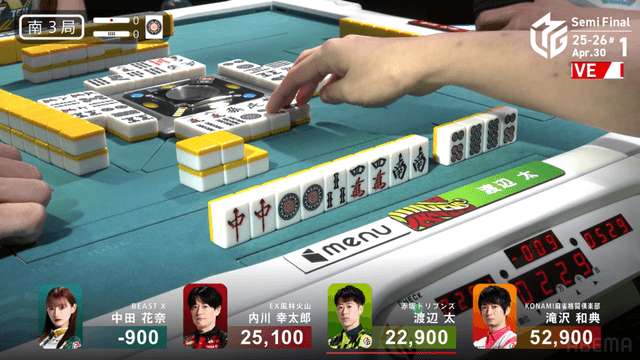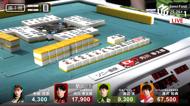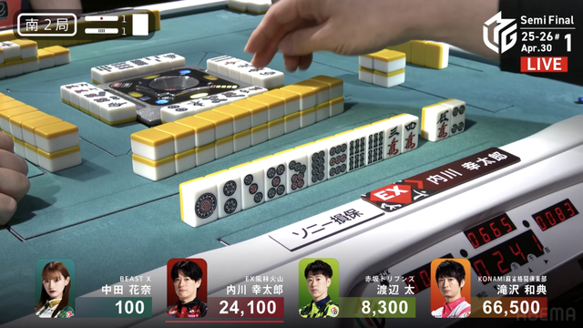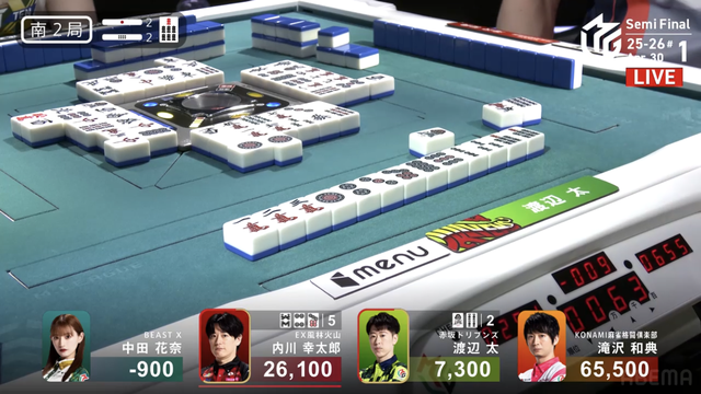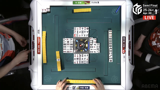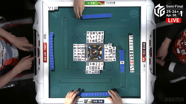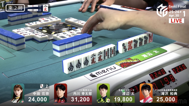 南4局、チームのファイナル進出が決定的なため、ファイナルのために素点を回復しておきたい中田が![]()