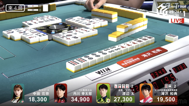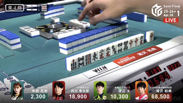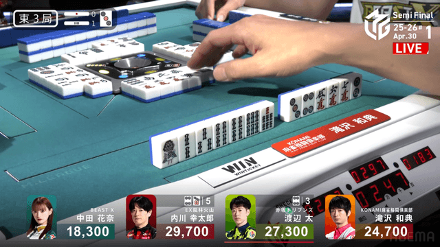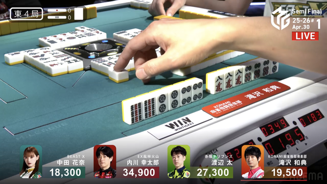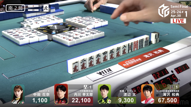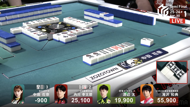 をツモり、2000・4000のアガリ。このアガリによって滝沢がチームのファイナル進出をほぼ確定させる大きなトップを獲得した。