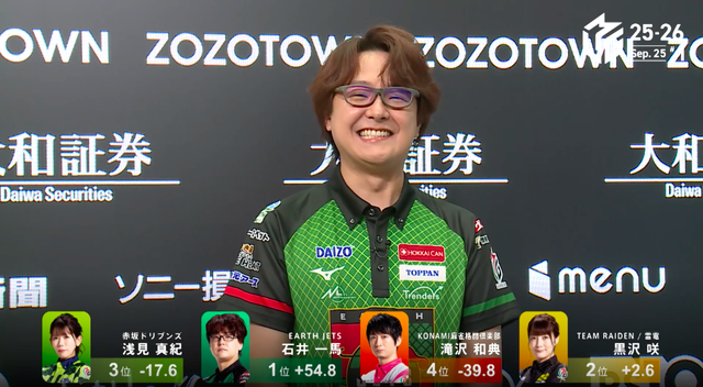 EARTH JETSは開幕戦に出場する選手を大会形式のYouTube企画で決め、石井はその権利を勝ち取った。「開幕戦はワクワクしながらも、責任を感じていました。対局相手は他の対局で何度も打ってきた鈴木優さん(U-NEXT Pirates)、園田賢さん(赤坂ドリブンズ)、下石戟さん(BEAST X)だったんで、気持ち的にはリラックスできていた気はします。結果は3着でしたが、最終局でツモアガリトップ条件は残せたので、自分の中では精一杯やれた実感はありました」